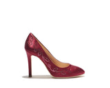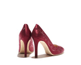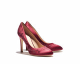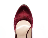 HENNA the classic toe pump with a soft toe and a new stiletto heel. Leather lined with a leather sole, they are finished with a classic wine satin fabric upper. It is inspired by Indian "Mehdi art" and the motifs are decorated with genuine swarovski® crystals in color wine, . Made in Italy. Heel height measure 100 mm/4 inches.