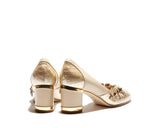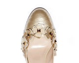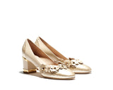 BLOSSOM is a modern round toe pump with a chunky heel that also adds stability. Leather lined, the upper is nude python finish and nappa with elegant detailing of gold nappa leather on the heels. Inspired with flowers made from nappa and suede leather decorated with swarovski® crystal stud at center in color gold making it a style statement. 100% Made in Italy. Heel height measures 70mm/2.7 inches.