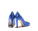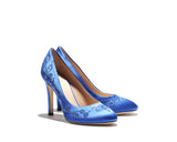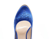 HENNA the classic toe pump with a soft toe and a new stiletto heel. Leather lined with a leather sole, they are finished with a classic blue satin fabric upper. It is inspired by Indian "Mehdi art" and the motifs are decorated with genuine swarovski® crystals in color blue, .  Made in Italy. Heel height measure 100 mm/4 inches.