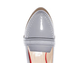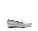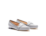 BELLA is a classic moccasin where in designer have mix 2 finishes of leather in color light greay as upper (piping & toe cap in patent and pebble grain finish on sides). Leather lined with a leather sole. Wrap detailing in color red leather uplifts the look. 100% made in Italy with heel height as 1 cm