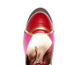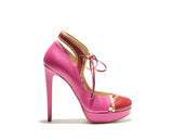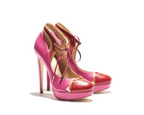 JANE is a classic round toe pump with a towering stiletto based on a thick platform. Soft nappa leather string with golden metal trim at the corner giving it an elegant detailing. Beautiful complimenting colors (Orchid and Amaranto) on leather upper. Leather lined and finished with a leather sole. Its 100% Made in Italy. Heel height measures 132 mm/5.25 inches with 25 mm/1 inch platform.