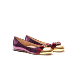 JOY a beautiful ballerina where in designer has given very elegant touch by mixing the colors in metallic gold and metallic pink leather. Leather sole, leather lined, grosgrain tie with a delicate branded metal piece on the toe are the key characteristic of the style. Its 100% Made in Italy.