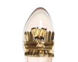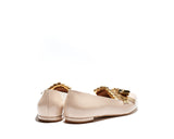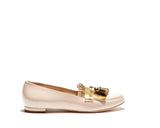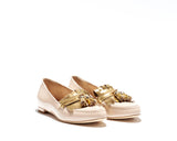 MIKELA is classic moccasin style with beautiful combination of Nude patent leather with shiny golden leather. Golden leather tessels with golden trim make it a beauty. Leather lined with leather sole. 100% made in Italy with heel height 1 cm.