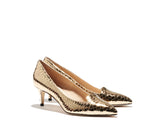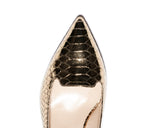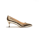 AUDREY is the classic pointy toe kitten. They are finished with a classic golden color python print leather upper. Leather lined with a leather sole. 100% Made in Italy. Heel height measure 55mm/2.2 inches.