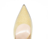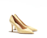 ROSE is the classic pointy toe pump with a softer point and a new stiletto heel. Leather lined with a leather sole, they are finished with mini leopard print leather upper in color light yellow. 100% Made in Italy. Heel height measure 87mm/3.4 inches