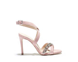 AMELIA From red carpets to wedding event, these strappy sandals are iconic in itself. The delicate straps beautifully wrap around the foot and give support from heel to toe. Leather lined with a leather sole, they have one buckle on ankle strap which can be adjusted. Finished with a pink textured leather, enriched with 150+ swarovski® crystals detailing on the upper where in each and every crystal is hand stitched onto the upper . 100% Made in Italy. Heel measures 102mm/4.01 inches.