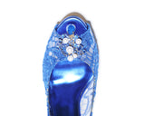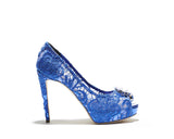 ETERNIA is a beautiful peep toe with a towering stiletto based on a thick platform. Blue shiny lace on mesh is bringing elegance along with the stability to the style. Its decorated with pearls and blue swarovski® crystals at toe on a golden metal frame. Its one of its kind combining the elegance with style. Leather lined and finished with a leather sole. Its 100% Made in Italy. Heel height measures 115 mm/4.5 inches with 30 mm/1.2 inch platform.