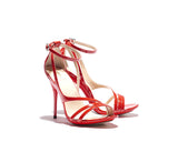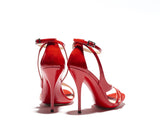 AMBER is a sandal with modern fashion touch. Designer have played with the straps giving a proper balance of coverage and exposure of the foot. It gives a sexy and confident edge whilst also providing support and comfort. Leather sole and leather lined, with a blood red patent leather upper. The base is made out of a single mold including the heels with elegant curves onto the sandal. 100% Made in Italy. Heel height measures 115mm/4.5 inches