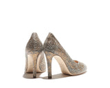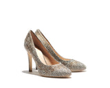 HENNA the classic toe pump with a soft toe and a new stiletto heel. Leather lined with a leather sole, they are finished with a Golden sparkling fabric upper. It is inspired by Indian "Mehdi art" and the motifs are decorated with genuine swarovski® crystals in color gold, . Made in Italy. Heel height measure 100 mm/4 inches.