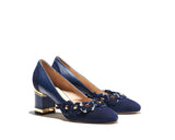 BLOSSOM is a modern round toe pump with a chunky heel that also adds stability. Leather lined, the upper is navy suede and nappa with elegant detailing of gold nappa leather on the heels. Inspired with flowers made from nappa and suede leather decorated with swarovski® crystal stud at center in color gold making it a style statement. 100% Made in Italy. Heel height measures 70mm/2.7 inches.
